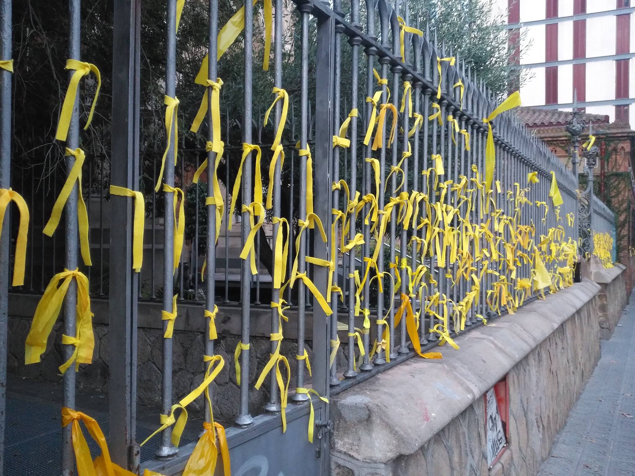 Желтая ленточка не так давно стала символом поддержки политзаключенных сторонников Каталонии. Известные политики, спортсмены, музыканты во всем мире публично надевают этот символ в знак солидарности. И конечно же на День Каталонии вся Барселона была в лентах.