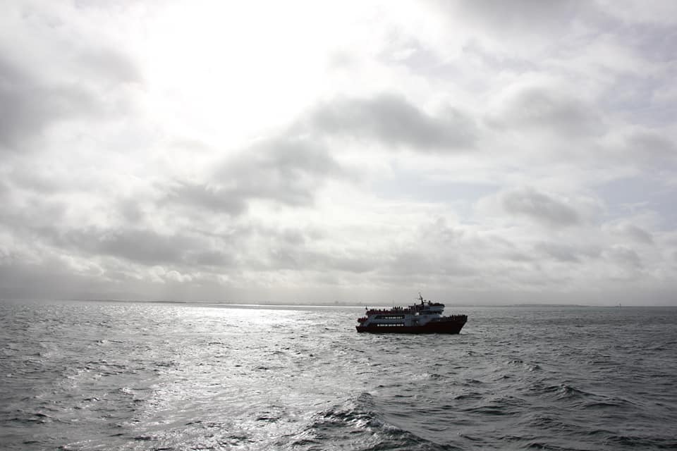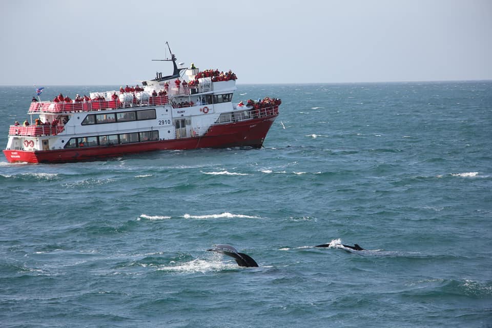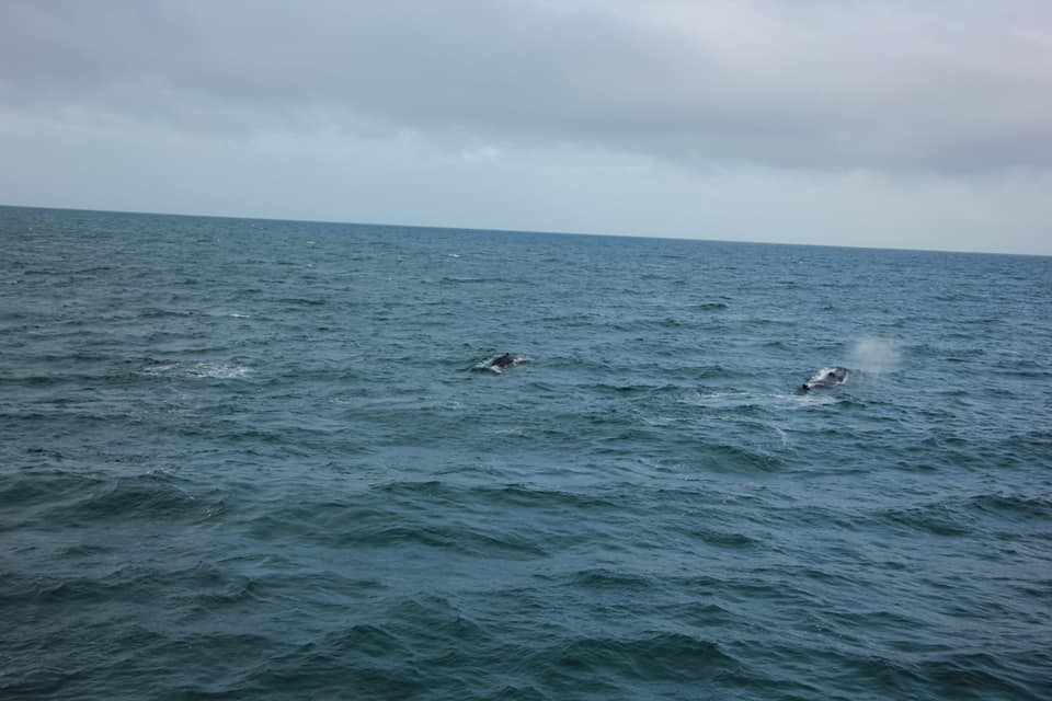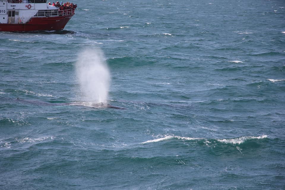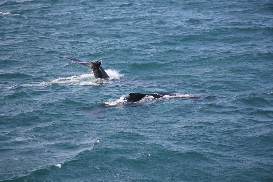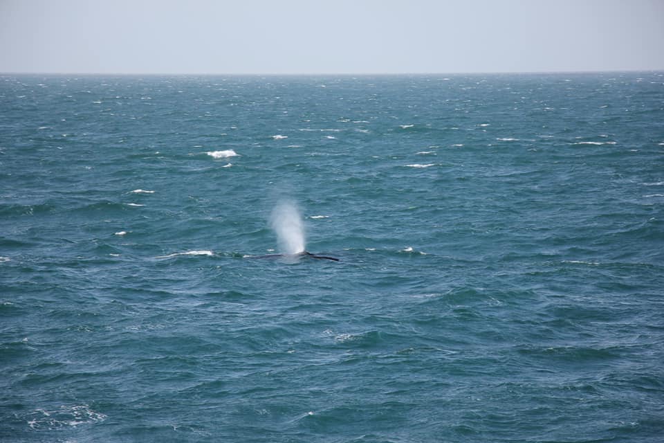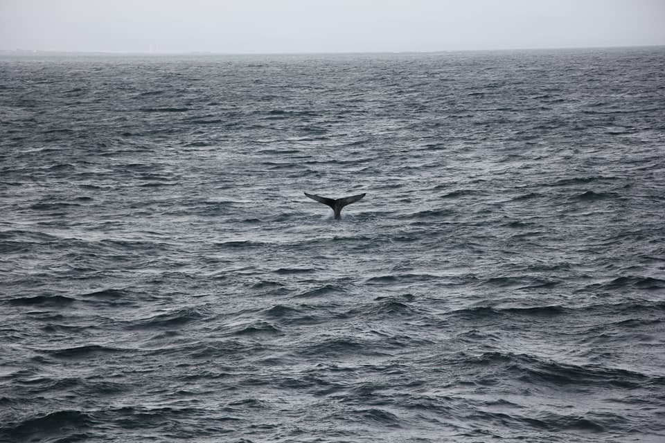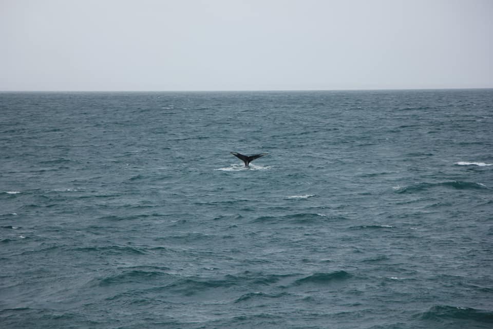 Проще всего замечать китов именно по фонтанам - они хорошо видны даже на большом расстоянии. А хвост означает, что кит нырнул и вернётся через минут 5.