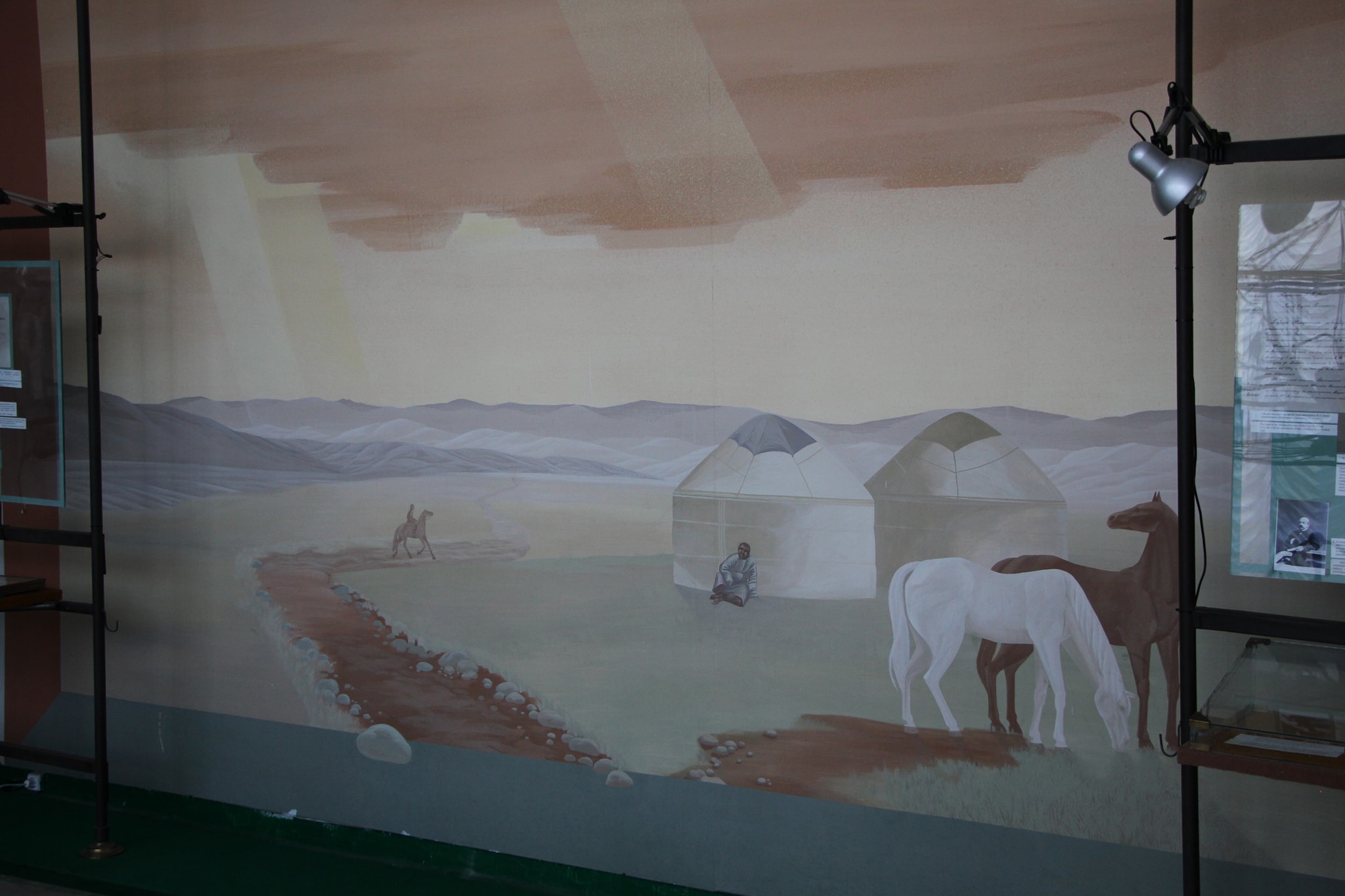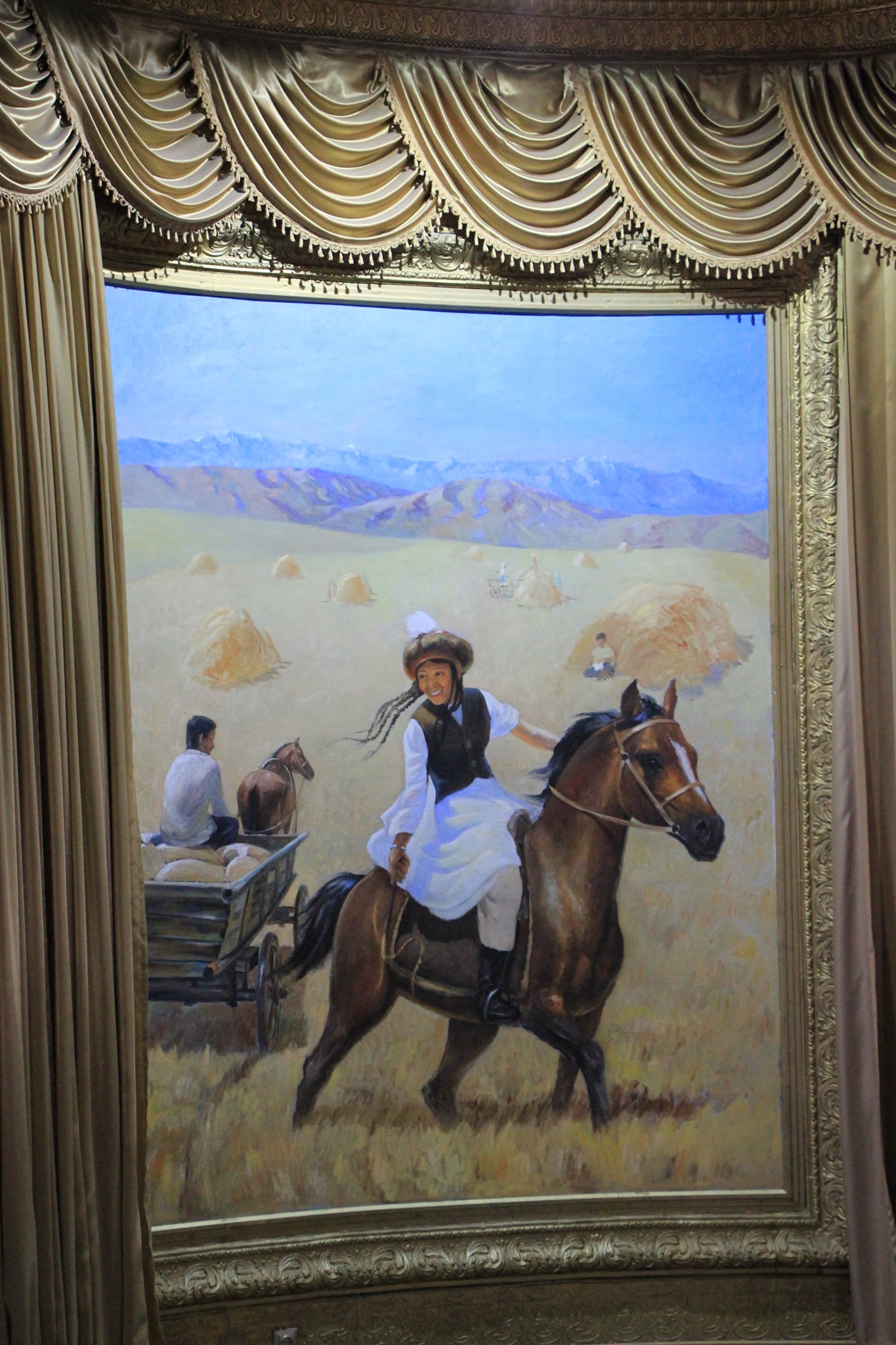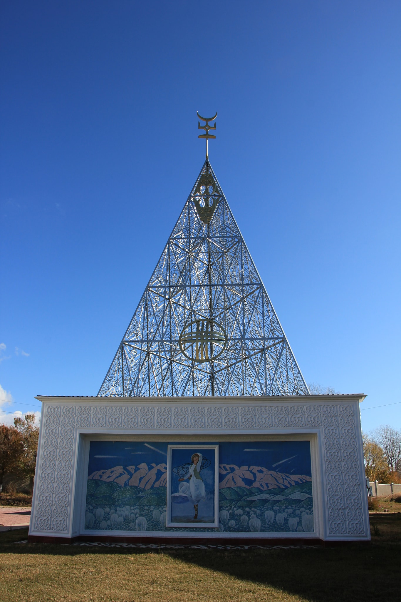 В центре (вообще-то в углу) садово парковой композиции зал Айтматова. В нем картины где он в планетарном антураже и сцены раскулачивания местного бая.