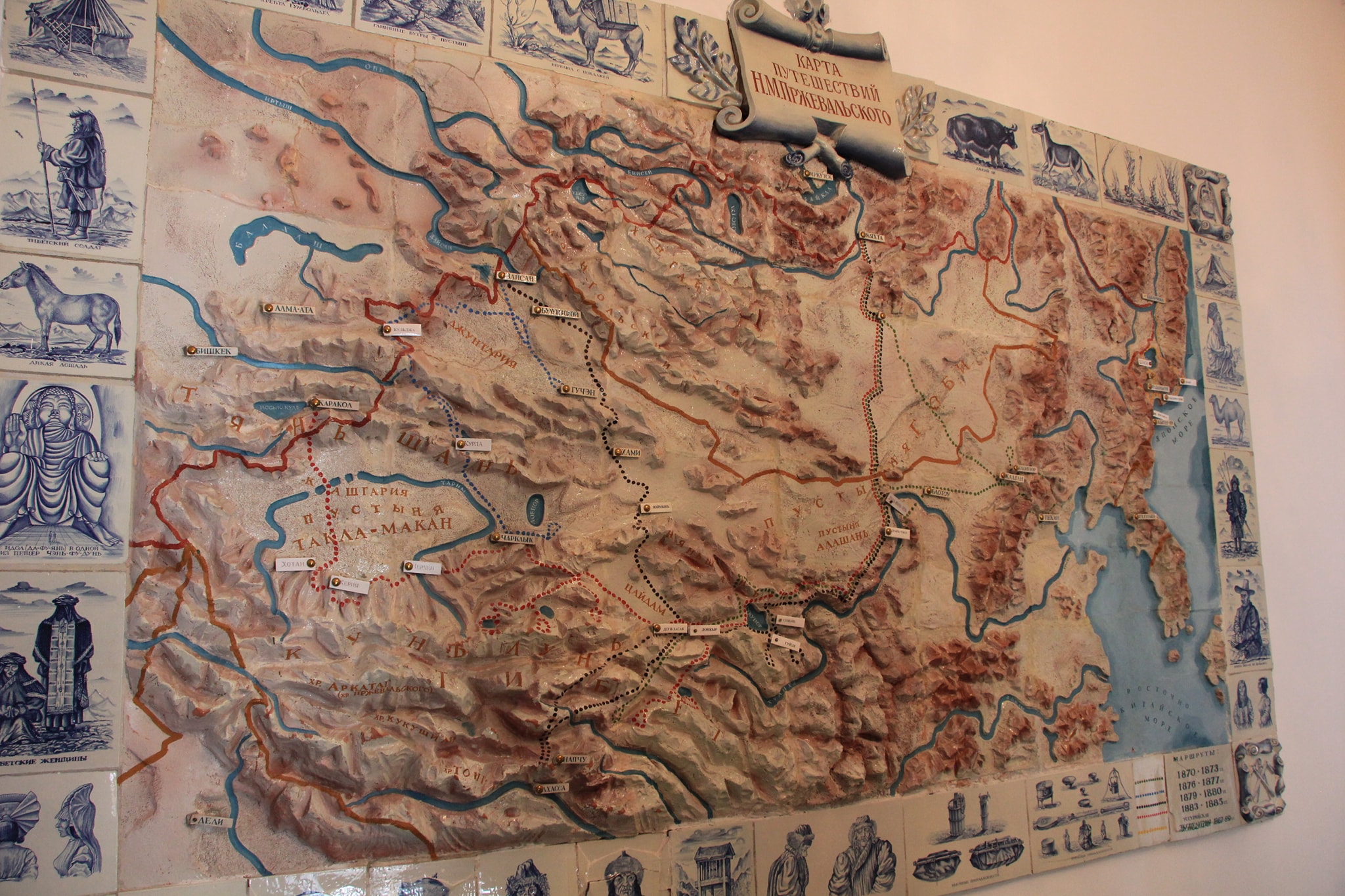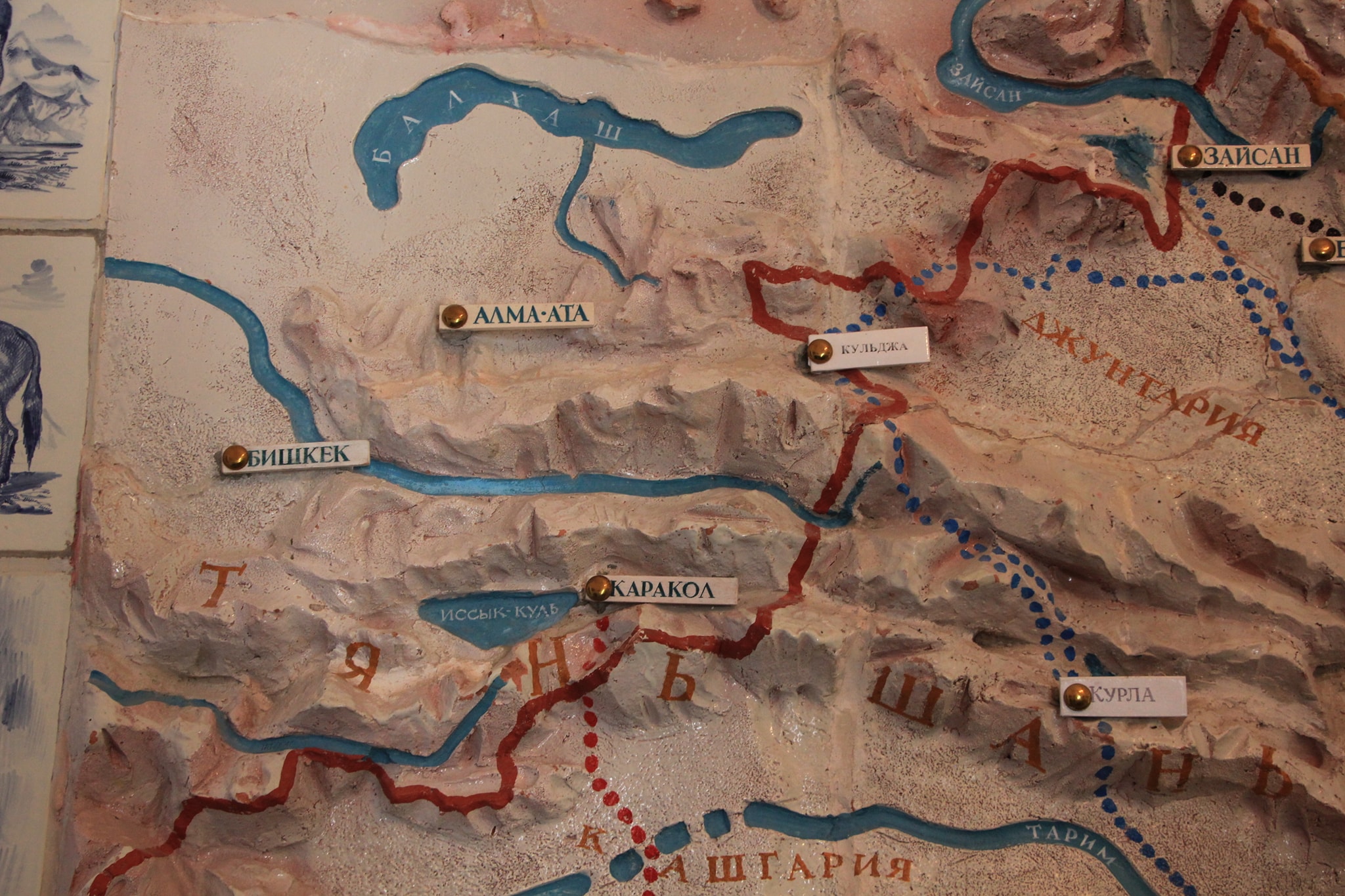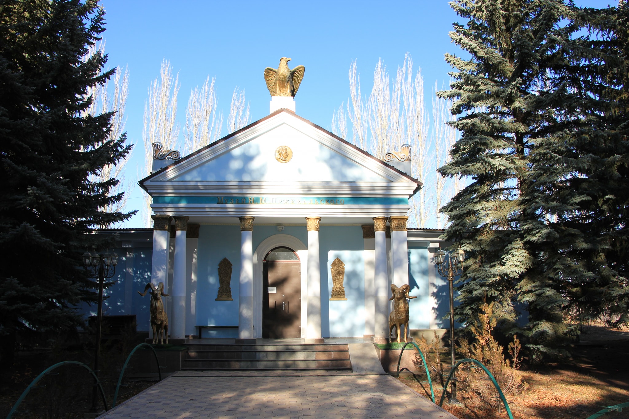 В центре (вообще-то в углу) садово парковой композиции зал Айтматова. В нем картины где он в планетарном антураже и сцены раскулачивания местного бая.