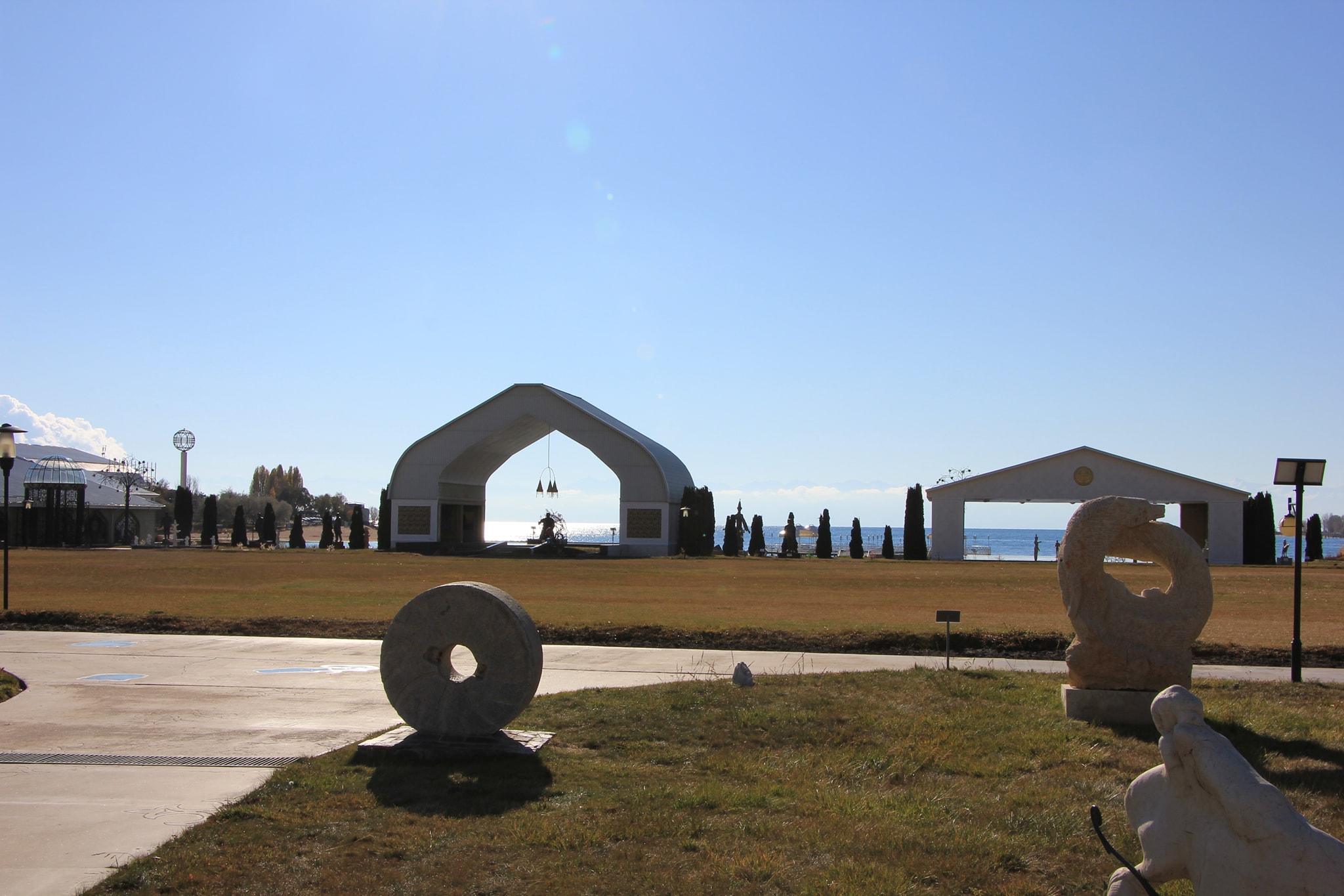 Посетили культурный центр «Рух Ордо» им.Ч.Айтматова. Я скептически отношусь к творчеству и личности Айтматова и потому получил огромное удовольствие. Композиция парка, это такое мини Скопье, но со вкусом и юмором. Айтматову в компанию выделили: