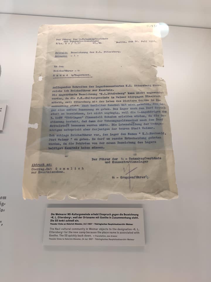В 1937 культурное сообщество Веймера написало гневное письмо в СС по поводу строящегося по соседству концлагеря. Их возмутило... название. Изначально, Бухенвальд планировали назвать Еttersberg. Но культурное сообщество указало на то, что это название ассоциируется с Гёте. Руководство СС с пониманием отнеслось к протестам интеллигенции.