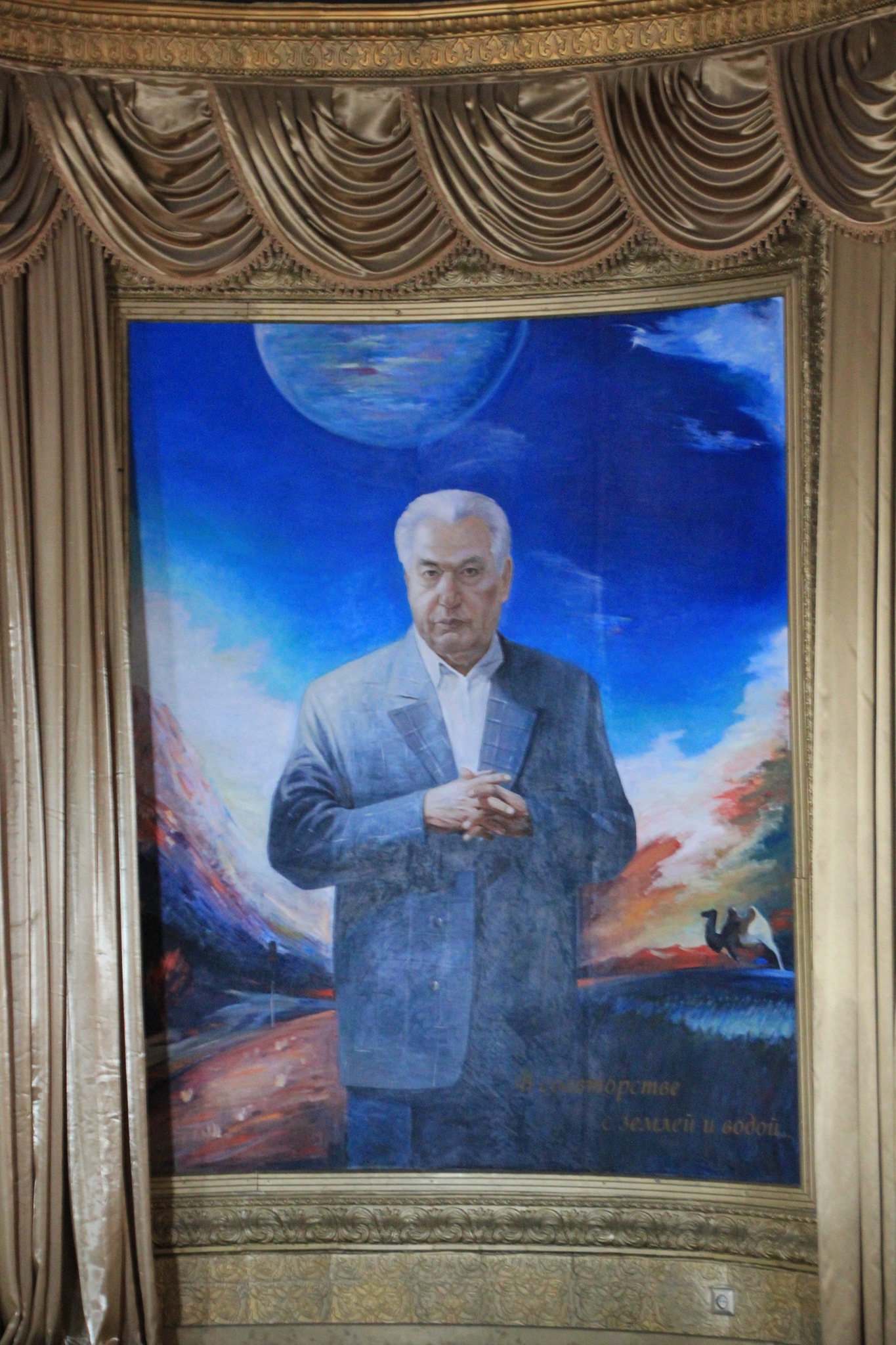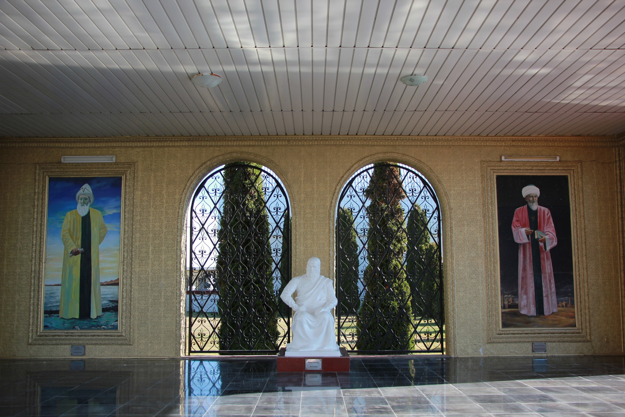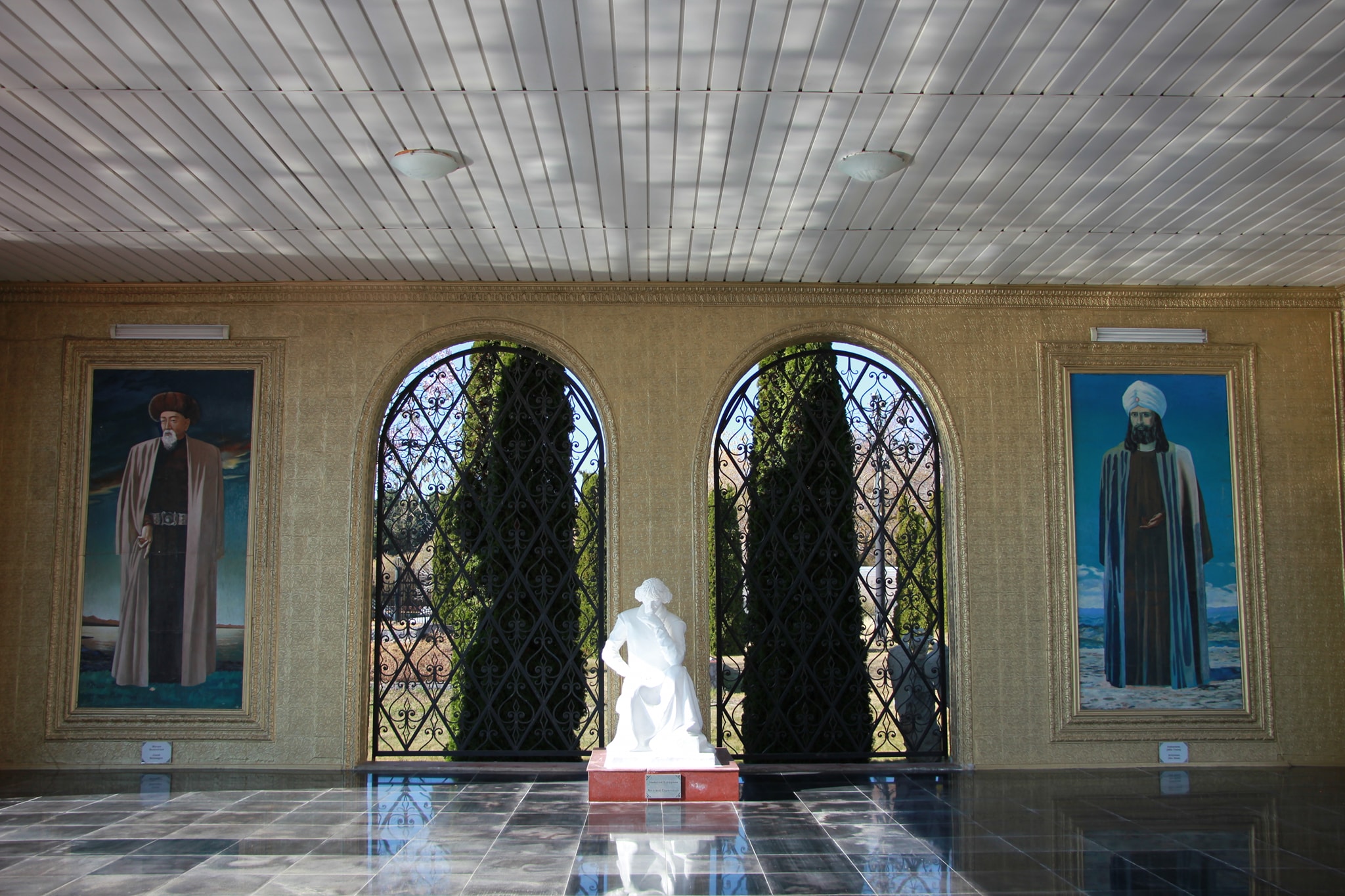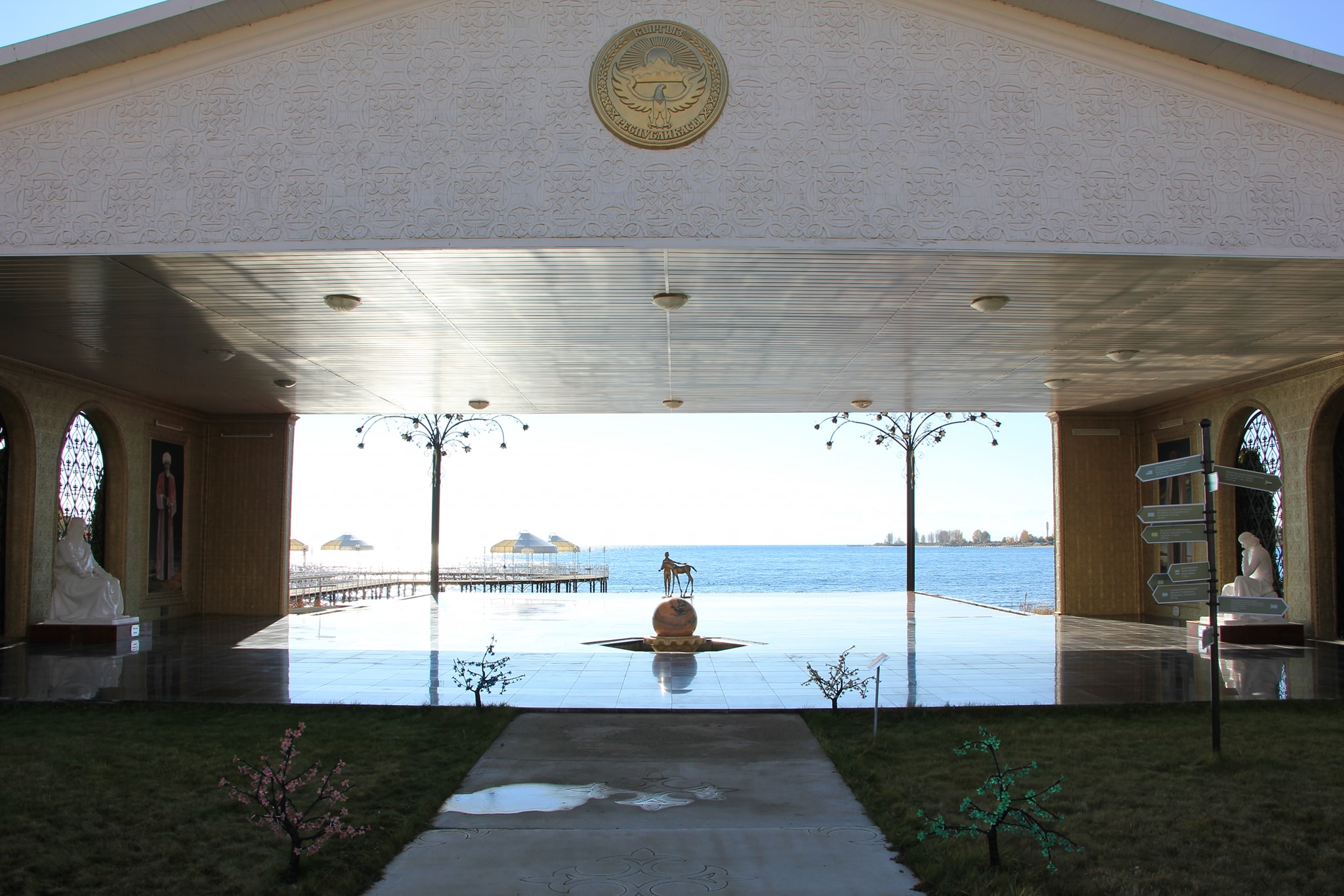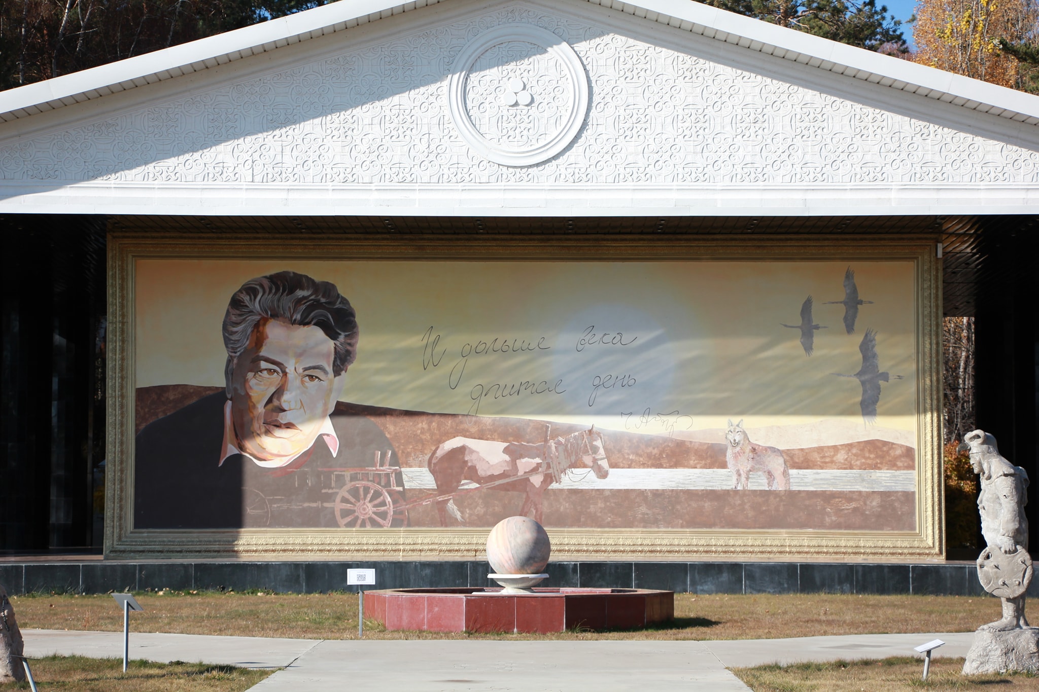 В центре (вообще-то в углу) садово парковой композиции зал Айтматова. В нем картины где он в планетарном антураже и сцены раскулачивания местного бая.